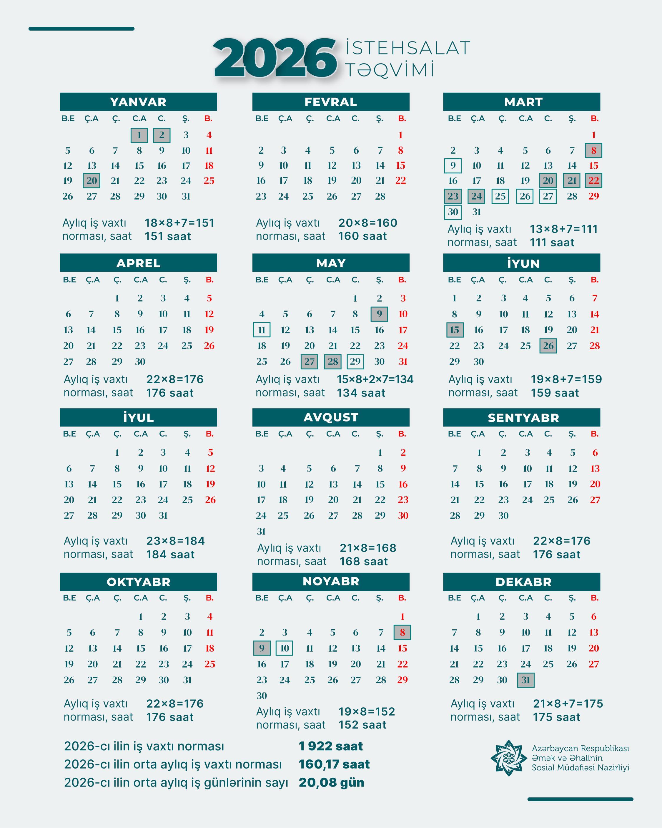 • 2026-cı il üçün 40 saatlıq iş həftəsində iş vaxtının illik norması 1922 saatdır.